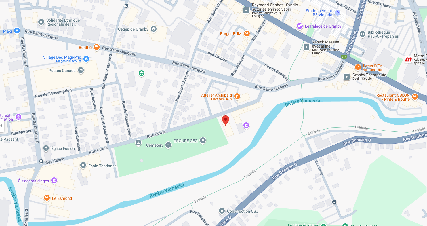 Nous sommes situés au 166 Rue Cowie, Granby.